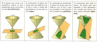 Se conoce como curvas cónicas el conjunto de curvas obtenidas al seccionar una superficie cónica con un plano; la inclinación de ese plano con respecto al eje de la superficie cónica determina la curva concreta obtenida.